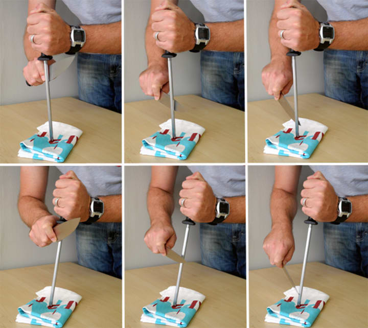 Repeat several times until the blade is feeling restored. You can also try this with the steel resting on a tea towel, on a table, as shown here.